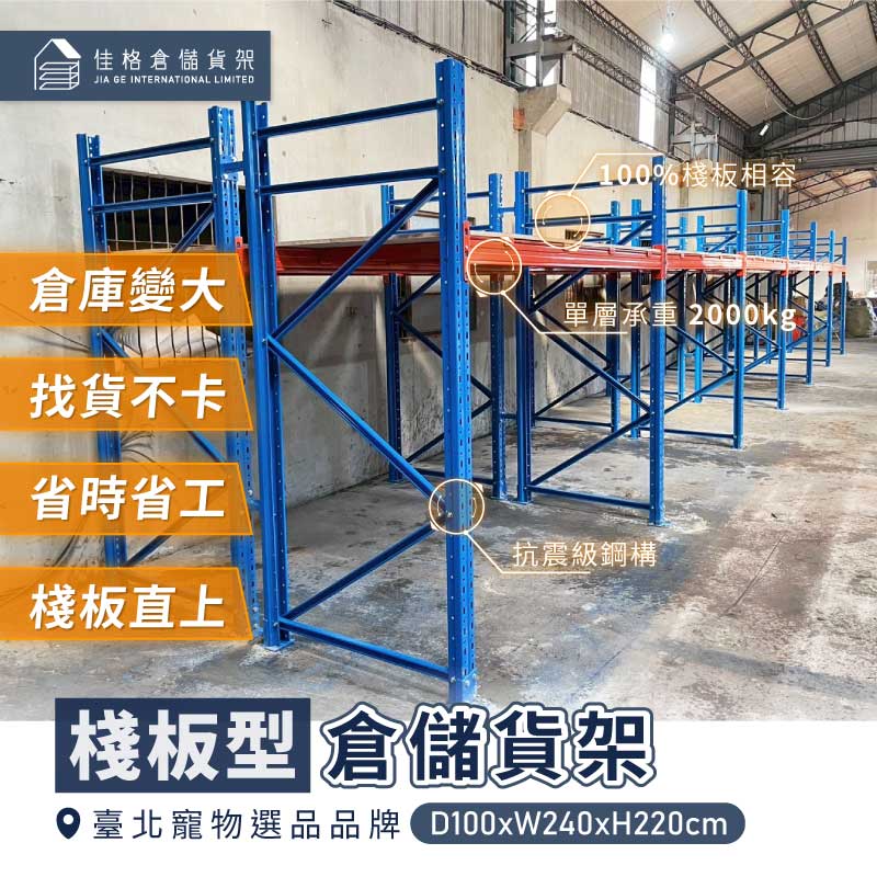 - 設備:棧板型倉儲貨架 深100 x 寬240 (內徑220) x 高220cm